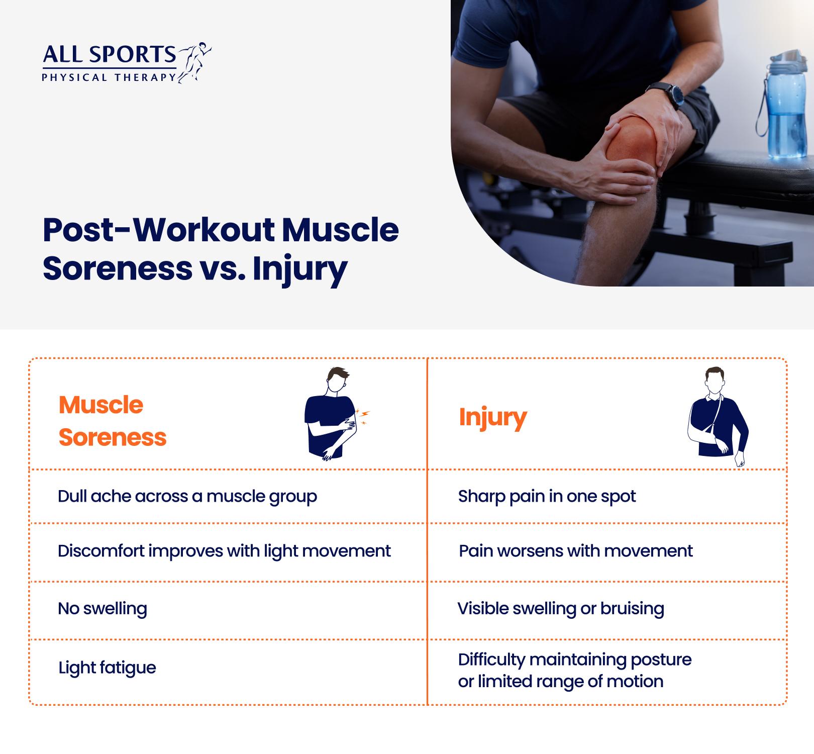 To help you tell the difference between normal post workout soreness and a potential injury, here are a few key signs to look for.